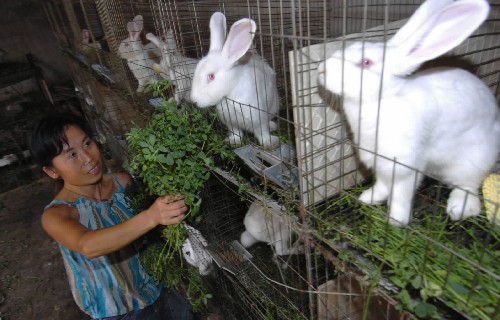 7月12日,在贵阳市乌当区高新路街道办事处阿栗村,村民王丽正在喂养大白兔。2006年6月到今年7月,王丽家喂养的大白兔出栏近200只,收入8000多元。