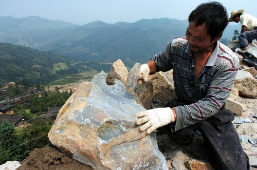几位筑路工人在从江县丙妹镇开山修筑通村公路。