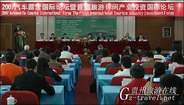 9月26日,由贵州省旅游局、省体育局贵阳市旅游局主办的“2007汽车露营国际论坛暨首届旅游休闲产业投资国际论坛”在风景如画的红枫湖畔水上体育训练基地隆重举行。当日,参加这次论坛会议的各国代表、贵州禹石旅游文化传播有限公司、北京中展朗天科技会展公司代表及贵州省内有关企业代表共300余人。贵州省委常委、宣传部部长谌怡琴、国际露营协会主席佩雷拉先生、北京奥运经济顾问范克高夫先生出席会议并讲话。
