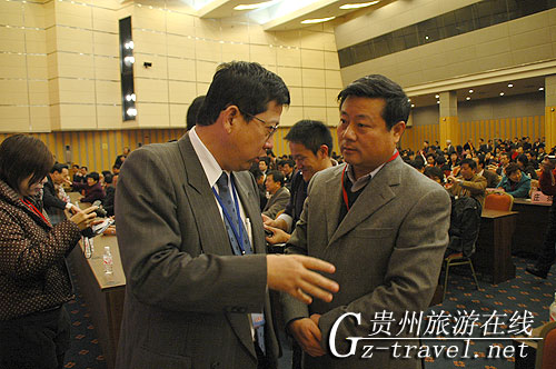 贵州省旅游局副局长傅迎春(右)与台湾旅行商商谈