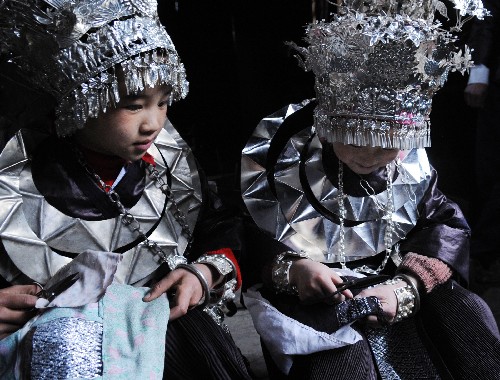 3月15日,剑河县南寨乡展留村的两位苗族小朋友在学习传统的锡绣工艺。