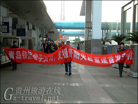 本站讯 3月18日,由青岛开来的旅游专列抵达贵阳。自雪凝灾害过后,贵州旅游在后重建工作的迅速开展,全省在雪凝灾中受损的旅游设施、旅游景区、景点已于本月初全面修复,目前景区道路全面通畅,旅游接待能力达到灾前水平。此专列是继灾后新加坡包机后贵阳市接待的首个大规模旅游专列。贵阳市委、市政府高度重视,在专列抵达贵阳时特举行了欢迎仪式,贵阳市旅游局及相关部门领导到站台迎接专列游客。