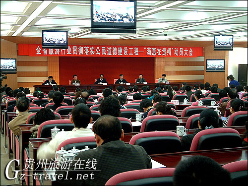 会议由贵州省旅游局副局长杨俊宣读“关于全省旅游行业贯彻落实公民道德建设工程——‘满意在贵州’主题活动的实施意见”。意见中明确工作思路、工作目标、工作重点以及一系列方法步骤保障措施,按照《公民道德建设工程实施方案》的总体要求,以“三个代表”重要思想和党的十七大精神为指导,全面贯彻落实科学发展观,坚持以人为本的服务理念,以树立“满意在贵州”的形象为出发点,以健全制度和建设标准为切入点,进一步深化旅游行业建设工作,以提高管理水平、提升从业人员素质和服务质量为重点,规范行业服务行为,深化行业服务内容,拓展行业服务空间,用三年时间,使“满意在贵州”服务理念深入人心,渗透到服务行业的方方面面,游客满意度达到90%以上,努力实现每位游客都“满意在贵州”的目标。