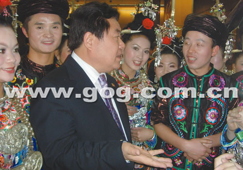 侗族大歌合唱队自17日晚参加第一轮决赛以来,一路过关斩将,特别是18日晚以来,侗族大歌合唱队一直受到人们的关注,19日晚开赛之前,央视主持人董卿再次与选手交流了解侗族大歌文化背景,中央电视台《幕后》栏目记者曾专门采访侗族大歌合唱选手。当晚,选手们表现自然、自信。赛后,徐沛东评委接受记者专访时说,侗族大歌是此次参赛的全国46支合唱团中唯一的无指挥合唱队,成为整个合唱大赛中最大的亮点,民族特色浓郁,合唱水平高,选手们团结和谐,让人感动。图为徐沛东评委赛后与侗族大歌合唱团队员交谈感受。