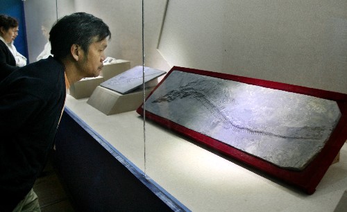 10月30日,观众在贵州省博物馆观看展出的贵州龙化石。