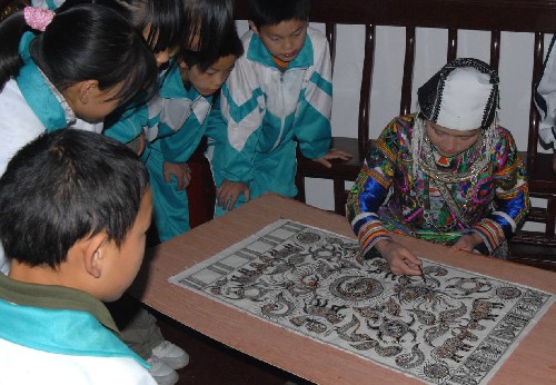 11月11日,苗族青年在贵州省博物馆内为观众展示蜡染技艺。