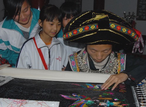 11月11日,苗族青年在贵州省博物馆内为观众展示刺绣技艺。