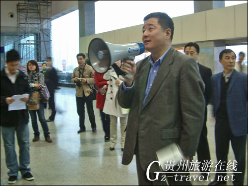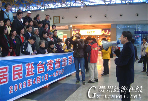 图为贵州省旅游局副局长杨俊向首批赴台游客致词