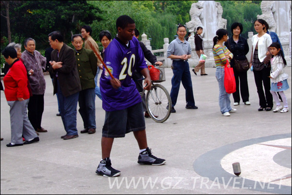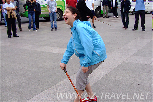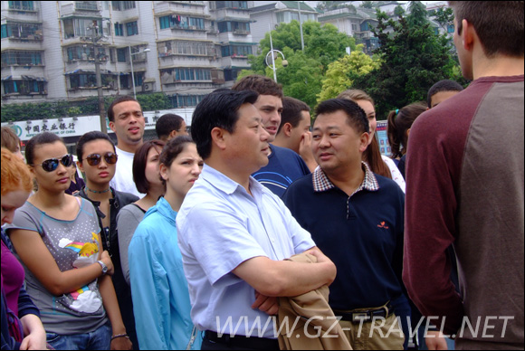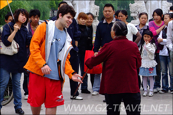 今天上午美国游客抵达贵阳市甲秀楼,贵州省旅游局局长傅迎春到场接见了他们,向他们赠送了贵州旅游纪念品,并为他们亲自担当了一次贵州导游,游客们兴致高昂。正逢清晨甲秀楼前很多市民晨练,美国游客们兴致勃勃的参与了中国的传统体育项目-打陀螺,与市民一同晨练,虽然语言不通却也其乐融融。