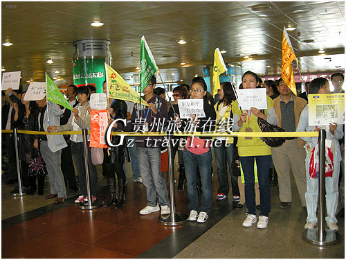 11月6日,贵阳龙洞堡国际机场迎客口小旗林立:仅上海飞贵阳的1个航班,就带来了贵州省中国国际旅行社、贵州省青年旅行社、贵州省中国旅行社和贵州春秋、贵州太平洋、贵州教育等旅行社接待的6个旅游团到贵州旅游。