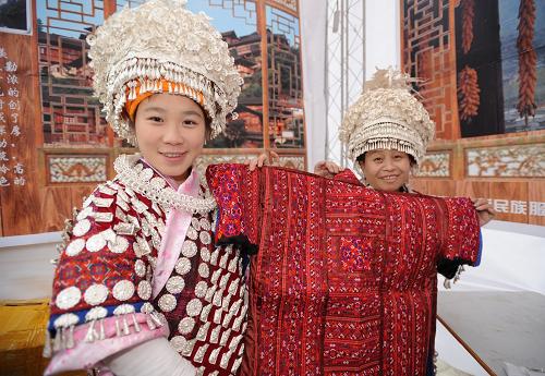 2009年“多彩贵州”旅游商品展销大会上,两位来自贵州凯里的苗族少女在展示纯手工绣制的苗族服饰(资料图片)。新华社记者 刘续 摄