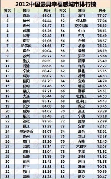 贵州旅游在线讯 近日,中国城市竞争力研究会公布了“2012年中国最具幸福感城市”100强排行榜,青岛、杭州和惠州依次占据前三甲,贵州有黔南、凯里、六盘水和贵阳上榜,其中黔南以34名进入前50强。
