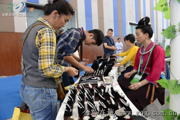 不仅如此,组织方还特意邀请了多名民族工艺“名匠名创”,现场展示独具特色的旅游商品。银饰、傩戏面具、地戏面具、蜡染画……丰富多彩的展品让游客目不暇接,围观人群络绎不绝。来自浙江的叶先生最近刚好在贵州旅游,原本是被“酒博会”吸引慕名而来,但一进展馆,就被贵州少数民族能工巧匠现场手工制作的蜡染画吸引,当即买下了好几幅。“特别喜欢这种民族的、原生态的东西,一看到就被被迷住了。”叶先生说,“酒可能带不上飞机,但是蜡染画我一定要带回家珍藏”。