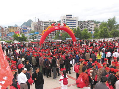 5月12日傍晚,铜仁市锦江广场聚集了近千位老人,他们由这里登车,前往京津进行为期8日的旅游。广场上站满了送别的人群,绝大部分是子女送父母出游,老人们的脸上荡漾着幸福的笑容,到处一片欢笑之声。此次活动由地区老龄委和铜仁青年旅行社联合举办。