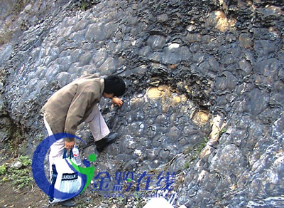 杨松通过实验发现这些岩石硬度较大,小刀划不动它们;加酸不起泡,排除了是碳酸盐的可能性,但是易碎。据了解,这儿以前是一处悬崖,上边是茂密的树林,下边有条小溪,2004年当地村民从这里修建了一条乡村公路。就在开路的炮声中,这些层层叠叠的石蛋堆积而成的石崖就露出来了。