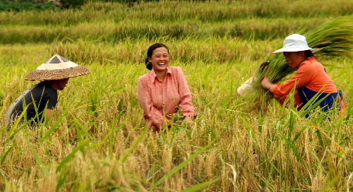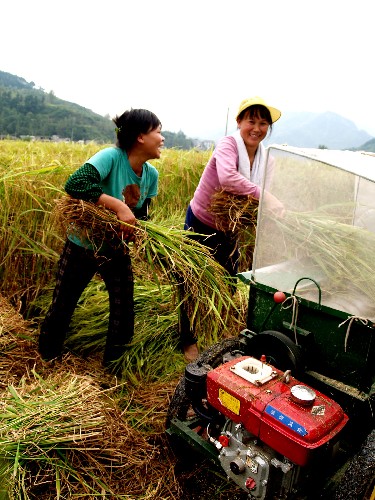 9月4日,贵州省印江县合水镇兴旺村几位农民在稻田收割水稻。