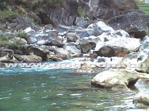 据了解,这条“热水河”位于石阡至铜仁公路旁的石固乡凯峡河村凯峡河南岸,距石阡县城25公里。热泉水从一溶洞中流出,溶洞长204.6米,最高处达40米,最低处0.5米,最宽处15米,最窄处仅0.5米。洞内有冷、热泉眼各1处,两股泉水在洞内混合成“地下热水河”,混合水流在距洞口20米处潜入地下,经伏流分散泻入凯峡河中,经测量,这条地下热水河河水常年恒温34℃。石阡县旅游局王副局长告诉记者,在这条地下热水河下游2公里内的河床之间,有数不清的出露点,但像这种生于河中,并与河水自然相融的温泉,在全国都少有。