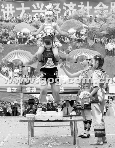 苗族同胞表演的节目,展示了建国60年来在党的民族政策光辉照耀下苗族人民的幸福生活,弘扬边区民族传统文化,增强民族团结,振奋民族精神,展示边区风情风貌。