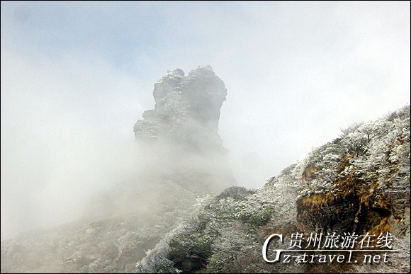到了山门时,因为是淡季,根本就没多少游客,梵净山的大门也还在修建当中。到我坐上索道上时,俯瞰群山,先是绿茵茵的茫茫林海,过了一会就变成了满上红叶层林尽染,接着就进入了云雾中,索道快到上站的时候,穿过了云层,我眼前顿时一亮,真的是下过雪,一片白茫茫的,琼楼玉宇,洁白一片。