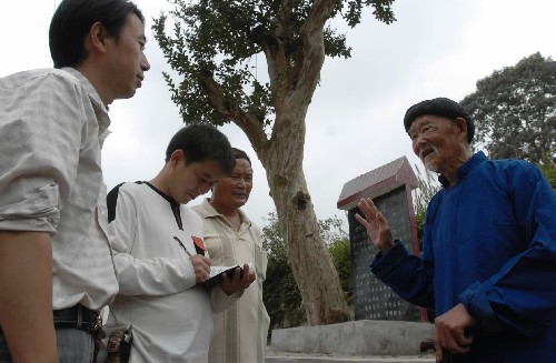 9月27日,在贵州省遵义县乌江镇养龙村九寨村民组,92岁高龄的曹儒香(右一)老人在讲述村民为纪念牺牲的红军种下三棵紫荆树的故事。