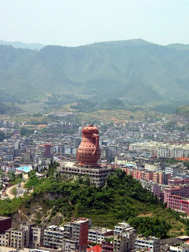 位于贵州省湄潭县的一个巨型茶壶建筑,日前因其2.8万多立方米的体积而被上海大世界基尼斯总部授予(中国之最)最大实物造型。