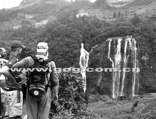 图:7月3日,两名外国游客在代家沟瀑布景区游览观光。