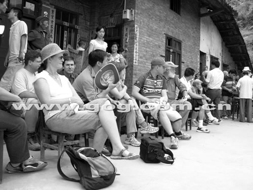 图:众多外国游客在乡村旅馆休闲纳凉。