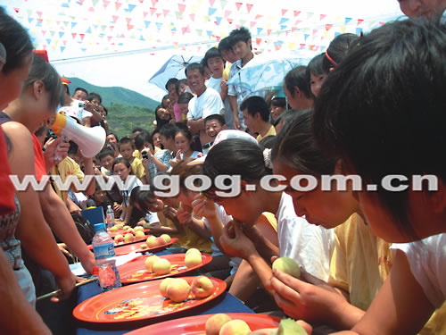 6月6日,桐梓举办首届松坎桃子节暨古盐道漂流剪彩仪式,来自重庆、贵阳等地的游客参加了当天的品桃及漂流活动。图为游客正在参加吃桃子比赛。