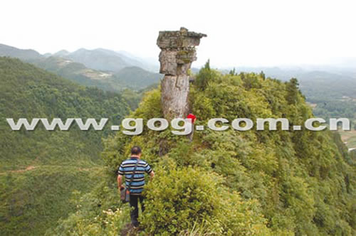 近日,记者在凤冈县发现一奇特的“蘑菇石”。该县永安镇田坝村八角山上丛林环绕,惟有一墩石头突兀耸立,该石头高5米,下半部呈圆柱形,上半部分呈方形,顶部平坦,约有2平方米宽,其状酷似蘑菇。