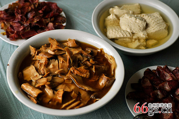本网讯 赤水饮食上的“三个代表”是指:腊肉(代表赤水的红色丹霞地貌),笋子(代表赤水的竹子),豆花(代表赤水的水)。