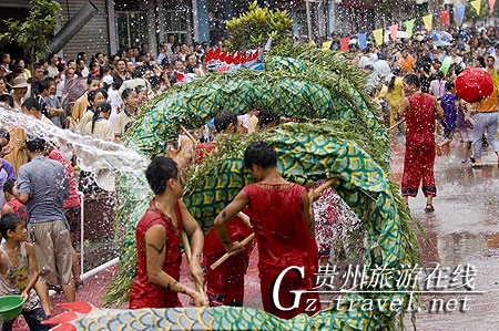 泼水龙的水是“吉祥水”,水泼得越多,则表示吉祥如意,兴旺发达,当年就一定会风调雨顺,五谷丰登,国泰民安。如果谁要有幸被泼上吉祥水,就会事业发达,财运兴隆,万事吉祥如意。
