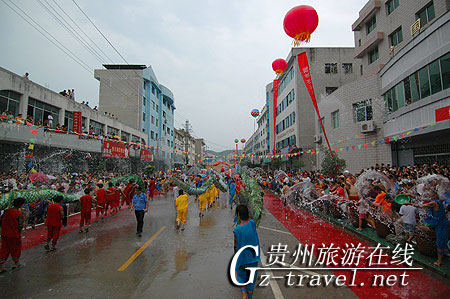 施秉县城玩水龙已有上千年历史。关于“水龙”,在施秉民间有这样一个传说。相传很久以前,有一年久旱无雨,太阳像火一样晒得百花凋谢,五谷不长。人们想尽了各种方法,而老天爷根本没下一滴雨,天下越干越厉害,没有办法的人们只好听天由命了。 一天晚上,一位神仙托梦给一位叫宝公的老人说:“龙、人和狗是亲兄弟,人是老大,龙是老二,狗是老三。兄弟仨长大后,龙分家得到的家产极少,他想不通而负气出走,不想回家。后来,龙成为了掌管风雨的神,可只要一想起分家的事就很生气,于是故意不下雨,让天干使人得不到好收成。你们如果想得雨,就扎一条水龙,抬上狗,敲锣打鼓上街舞一趟,还要边舞边泼水,一直把龙舞到河边,让龙知道你们心里还有他这个兄弟,这样他就会降雨了。”宝公喜获此言,第二天立即去和寨老们一商量,大家都很赞成扎一条水龙来舞。于是,宝公和寨老便组织各条街道的群众编扎龙,热热闹闹地舞上街,一直舞到河边做完祭祀仪式才回家。果然,龙见到人舞着龙,抬着狗来到河边,想三兄弟又象当初团聚在一起,念及弟兄之情,就呼风唤雨,降下甘霖,解除了人间的旱情。从那以后,每逢五黄六月久旱无雨,群众就择定吉日玩水龙求雨,舞龙的队伍所到之处,街道两侧的居民就用水泼龙,舞龙结束后将水龙投入舞阳河任其自行沉入水中。群众都说泼水龙的水是“吉祥水”,水泼得越多,则表示吉祥如意,兴旺发达,当年就一定会风调雨顺,五谷丰登,国泰民安。如果谁要有幸被泼上吉祥水,就会事业发达,财运兴隆,万事吉祥如意。