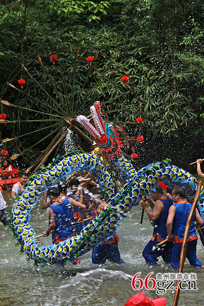 施秉玩水龙已有上千年历史,相传很久以前,有一年久旱无雨,太阳像火一样晒得百花凋谢,五谷不生。一天晚上,一位神仙托梦给一位叫宝公的老人说:“龙、人和狗是亲兄弟,兄弟三长大后,分家时龙得到的家产极少,于是出走。后来,龙成为了掌管风雨的神,它只要一想起分家的事就很生气,故意不下雨。如果想求雨,就得扎一条龙,抬上狗,敲锣打鼓上街舞一趟,还要边舞边泼水,一直把龙舞到河边,让龙知道你们心里还有这个兄弟,这样他就会降雨了。”宝公喜获此言,立即去和寨老们商量,大家扎一条水龙来舞。果然,龙见到人舞着水龙,抬着狗来到河边,念及弟兄之情,降下甘霖,解除了人间的旱情。从那以后,每逢6月久旱无雨,群众就择定吉日舞水龙求雨。舞龙的队伍所到之处,街道两侧的居民就用水泼龙,舞龙结束后将水龙投入舞阳河任其自行沉入水中。老百姓都说泼水龙的水是“吉祥水”,水泼得越多,则表示吉祥如意,兴旺发达,当年就一定会风调雨顺,五谷丰登。有幸被泼上吉祥水的人,会事业发达,财运兴隆。上世纪50年代以后玩水龙这一传统一度消失,2005年在第五届杉木河漂流节上,施秉经过抢救和挖掘,推出了水龙表演项目,受到了热烈的欢迎。玩水龙时,只见色彩斑澜的水龙游街窜巷,边行边舞,沿途的群众有的用盆,有的用瓢,有的用桶,装满水后向水龙泼去,水龙则在“大雨”中盘绕腾挪,上下翻飞,水泼得越猛,水龙舞得越矫健。开始是人泼龙,到了后来,就成了人泼人,大家泼水狂欢,水龙所过之处,也变成了“水街”。而今,国泰民安,人民丰衣足食,玩水龙已不再是为了祭祀求雨,而成了当地的泼水狂欢活动。
