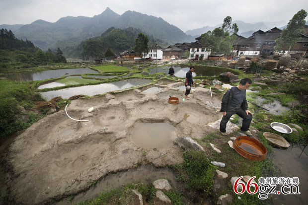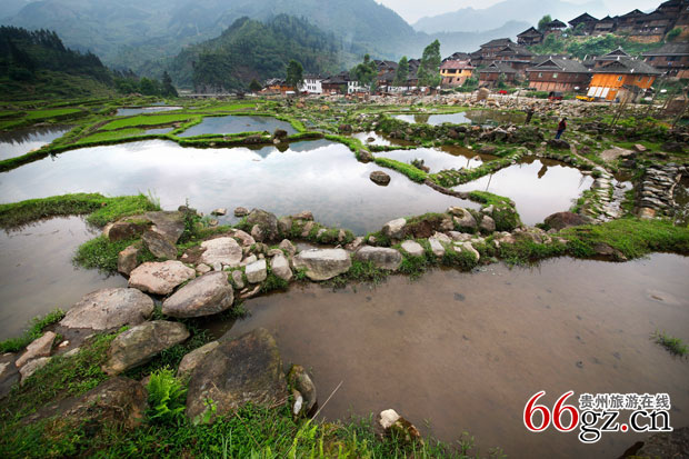 在贵州省黔东南州从江县西部月亮山腹地的那层层叠叠的梯田,是苗族人世世代代留下的杰作。苗族是“稻饭鱼羹”的民族。苗族的稻田都是依山而开,随山势地形的变化而变化,因地制宜,山坡海拔的高低,坡度的平缓及山坡的大小决定了梯田大小和形态。月亮山独特的地型地貌决定了这里的梯田面积最大不过一亩,大多数田都是只能种一二行禾的“带子丘”和“青蛙一跳三块田”的碎田块,最小者仅有簸箕大,往往一坡就有成百上千亩。这里的梯田最长的可达二、三百米,最短的不足一米。长达几百米一丘梯田每一部分的大小形态却完全不同。