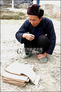 寻访陆铎公的足迹 为了印证传说,笔者前不久邀约贵州省水家学会理事会员韦章炳先生等人一起专程到水东村进行采访调查。 水东村位于独山县水岩乡东部,距乡政府10公里,与全国惟一的水族自治县——三都接壤,全村共有9个村民组,222户,1032人,均自称为布依族。但50岁以上的老人都说祖辈是讲水话的,由讲水话变为讲布依话也是两三辈人的事,并且在一些人家里,以前还藏有水书,只是整个寨子经历两次大火的洗礼后,现在遗留下来的东西已经很少很少了。 在采访中,有两个问题值得我们思考: 一是有关水族造字先生陆铎公的传说为什么在布依山寨流传下来了?二是这里的人们先是水族,为什么后来又成了布依族呢? 我们知道,在各种语系中,任何语言按其亲属关系可分为若干语系,又按亲属关系的远近分为语族和语支。我国民族语言种类繁多,据不完全统计,约有80多种语言。时下,人们将56个民族的语言划分为5大语系,10个语族,14个语支(不含分支未明的语支),即汉藏语系、阿尔泰语系、南亚语系、印欧语系、南岛语系。布依族和水族都属汉藏语系中的壮侗语族,只不过布依语属于壮傣语支,水族属于侗水语支而已。但这并不影响它们先天的亲属关系。其实,今天的水语与布依语有很多语言是相通的。故水东人的祖辈说水语,现在说布依语,是很自然的一种语言归类现象。 村民们听说我们来寻找陆铎公居住和造字的山洞,便热情地找来大捆的干竹子,将竹子捶破后,绑成火把,带我们来到寨子背后的深洞。深洞洞口高约10余米,洞厅宽20多米,在一颗巨石下,红红绿绿地贴着不少的纸符,鸡笼、鸭笼、猪崽笼堆满一地。向导介绍说,那是各地水书先生逢卯节后悄悄来拜祭所带的祭礼,祭诸神,也祭陆铎公。因为这种祭祀活动长期被当成迷信,水书先生被当成牛鬼蛇神,所以,来这里祭祀的人大部分都是秘密活动。 越往里钻,洞就越深,里面又不时传来流水拍岸的声响。大约钻了1个多小时,一路只看到地下阡陌纵横,头上钟乳石千奇百怪,有一片钟乳石上下相连,高约10至20米,形成森林之状,让人如入迷宫仙境。越往前,流水声越大,向导到此不肯前行了,我们找不到有人居住过的珠丝马迹,无奈只好随同撤出。 出来后,就发现有很多村民聚集于洞口,在等我们寻找的结果。其中,78岁的吴天明老人说:“歌谣里的陆铎公造字是在半坡上的那个洞,不是这个洞。” 于是,我们又请老人作向导,爬上了几百米高的山峰。 费尽九牛二虎之力,爬到了半坡的山洞口,发现这里是天然的绝好居住地,洞长约20米,宽七八米,无内通道,但石壁上有几个不深的小洞。而在洞口雨水淋不到的地方,却有两块平整的石块,坐在上面可以浏览山下四周。向导说山脚下有条常年不会干涸的溪流。有山有洞有水,这很符合人的居住条件。但任凭我们如何仔细地寻找陆铎公造字的遗迹,却怎么也没有让人振奋的发现。 正当我们沮丧地准备离开时,一个中年汉子跑过来说,自己的祖上有人是“水书先生”,家中还保存有四册水书和一个铜质秤砣。这意外的消息让我们兴奋不已,大家忘记了劳累,赶紧随他去家里。 这四册“水书”用一根细麻线捆着,解开一看,用粗草纸抄写的书已被虫蛀得七通八眼,从纸的制作上判断,这应该是清初时期的遗物。在一张破烂的桌子上,一颗铜质秤砣静静地孤立在上面。我拿过一看,秤砣为八角形,还有铜扣环,重约六两,上面阴刻三个谁也不认识的水书,虽然长期不用,但秤砣依然发出淡淡的青光,这很容易使人想到主人在打制它时的用心与偏爱。 征得主人同意后,我们把水书和秤砣带回县城拍照。 怀揣这些珍贵的典籍和遗物,离开水东村时,我忽然想起一句俗话:“秤不离砣,砣不离秤。”但今天的砣却离开秤不知多少年了,砣仍孤独地守望着,就像人们坚信这里是陆铎公造制水书的地方一样,每年仍有不少水书先生悄悄到深洞来拜祭。那虔诚的膜拜,不正说明秤与砣、师与徒的密不可分的关系吗?
