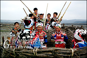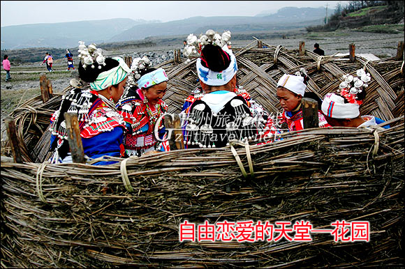 | 90年代以前,自由恋爱一直被很多人列为违背道德伦理一列,年轻人往往心向往之而不敢违,为此至今还流传着许多催人泪下的执著爱情故事。在龙里县居住着的一支白裙苗族却与众不同的保持着传统的自由恋爱方式,男女青年有专门的恋爱的场地和时间。 正月是新年的第一个月,也是一年中最休闲的时间,这里的苗族女同胞在正月有坐花园的习俗。花园,顾名思义是与花有关的场地,在这里的“花”是指雕花,“园”是指用箭竹或青藤编织围成占地在5个平方左右的圆形场地,按人数的多少来确定花园大小。分为已婚妇女花园和姑娘花园,七八个妇女一起在离家附近用捆好的柴禾围成一个圆圈,坐到里面做一些针线活,男人除了有特殊的事情外不会进入;姑娘花园则是用自己砍来的箭竹或者青藤亲自编织一个占地约5平方米左右(根据姑娘的数量来安排),形状呈圆形,高1.5m左右的场地,里面光滑,中间挖一个小火坑。姑娘花园既是年轻姑娘在一起雕花的场地亦是苗族同胞传统中自由恋爱的场所。 在每年的正月里,妇女们不需要做太多家务,平时里原本需要妇女做的饭炒的菜变成了男人的活,妇女坐到花园里只管雕花、整理衣物、为孩子装扮盛装、切磋雕花技艺等针线活或拉家常等;姑娘们在正月里不需要做家务。正月初一,姑娘们吃过早饭后各自带着自己雕花所需的针线、凳子、糯米粑相继来到花园里,这一天姑娘们只是安排好这一个月的任务和专心地雕花,糯米粑是中午的备用餐。从初二开始,花园的气氛会变得活跃起来,外面村寨的小伙首先会到花园附近提示花园里的姑娘。春节刚过,在正月十五之前村民忌讳在山上大叫,因此唱歌不是最好的方式,一般都会选用吹木叶的方式为引,之后慢慢接近花园,走到花园外围向里面看花园雕花的姑娘。小伙主动和姑娘说话,但姑娘却不一定会回答,她们会专心地雕花,这就要看一起来的小伙用什么方式让姑娘答话,在大家熟悉后会彼此介绍恋爱对象;小伙向对方表示自己爱慕最直接的方式是在姑娘不注意的时候把她头上戴着的头巾抢走,无论姑娘是否喜欢一般都会追过去,这样便提供了单独交流的空间,如果彼此喜欢则建立恋爱关系;如果姑娘并不喜欢,她会让别人去把自己的头巾要回来。 在整个正月里,出门不怕饿肚子,小伙出去玩即便没有亲戚父母不会担心。姑娘们会从家里带着糯米粑到花园里给小伙作午餐。 |