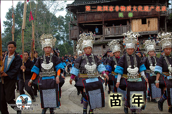 苗年的民俗活动很丰富,主要有祭祀祖先,吹芦笙踩堂,走寨结同年。芦笙踩堂在本寨芦笙堂举行,男吹女踩,男女都参加。先由小芦笙手吹出一阵短促的笙曲,接着大小笙手一起吹奏,姑娘们则穿着百鸟衣,戴着银首饰,银花冠翩翩起舞,银佩的脆响和着笙歌,交织成节日动人的旋律。