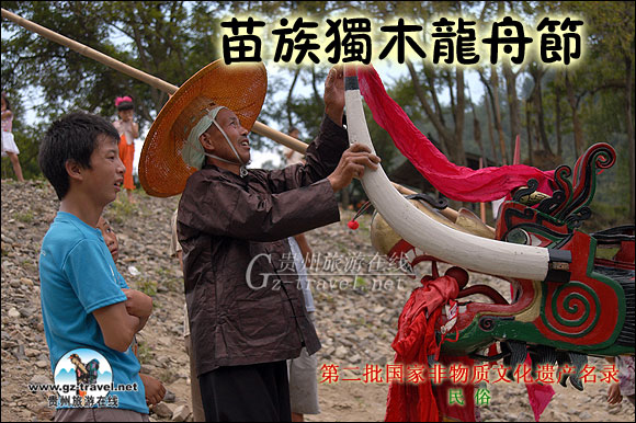 每年农历5月25日—5月27日,施洞一带居住在清水江边的苗族人民都要举行这一盛大集会,独木龙舟节历史悠久,但因苗族无文字记载,真正的起源于何时已无法考证。龙舟古朴硕大,别具一格,舟身用三根高大杉木掏空而成,中间一根独木为母舟,直径约70厘米,长约24米,两边各置一根直径约50厘米,长约17米的子舟,平时舟身被放置在村口专门搭建的亭子里,龙头则放在村里推选出的鼓主家,农历5月20日至23日期间巫师会按传统做法“起龙”,之后用竹篾将子舟和母舟并列扎成一排,装上精雕细刻的五彩龙头。由男人们把龙舟抬到水中,比赛当天,吃过中饭后,参加比赛的男人们清一色穿着家织的深紫色的亮布衣和蓝色布裤,腰扎一条织镶着银泡的腰带,头戴黄色的插着三根银片的马尾斗笠,每条龙舟载三、四十人,母舟前方坐有四个人:第一个坐在龙舟与龙头连接处,背朝前方,负责呐喊助威和靠岸撑船;第二个人是中年老人,背朝前方,负责鸣放铳炮,制造声势;第三个人是寨中德高旺众的寨老,也就是鼓主,背朝前方,身穿白色长袍,外套一件黑色马夹,头戴一顶大宽边帽,负责敲鼓。第四个是一个男扮女装的10多岁的小孩座着负责敲锣,在男孩的是面还有一个小龙头,捆绑一把黑伞为其遮荫,其余的水手分成两排站立在两只子舟上,在水手中间放有一桶糯米饭,饭上供有一只煮熟的鹅,有三位老人站在母舟的尾部,负责掌握龙舟的方向。龙舟出发前,各寨在龙舟附近的河滩上放一张四方桌,桌上有一升米,米上点有三柱香,放十二元钱,巫师手提一只公鸡站在桌边念巫词,招集山神、树神、祖宗前来保佑龙舟平安比寨,平安回归。之后巫师用茅草沾河水洒向龙舟并一刀把鸡杀死,比赛结束后,巫师又用同样的方法欢送山神、树神、祖宗。竟渡时,锣鼓喧天,舟上的人随着划水的节奏齐声大喊“嗨--嗨”。岸上的亲友也跟着龙舟奔跑并高声叫喊,气势磅礴,扣人心弦,龙舟节被推向高潮。