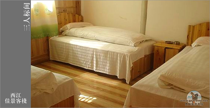 西江佳景客栈共设客房22间,设有夫妻大床间、两人间、三人间和多人间,可以满足西江旅游度假的游客、到西江的摄影者、到西江支教的教师和西江写生、采风的学生等不同需求人群。客房设有空调、彩电、独立卫生间、24小时大流量热水淋浴,每个房间均设置了免费无线网络信号,每个楼层均设有观景小客厅。虽然客房内没有电脑,但您可以免费使用佳景客栈一楼大厅的电脑。虽然客房里没有电话,但您可以使用佳景客栈为您提供的免费市话、国内、国际长途电话。佳景客栈靠前排的公共客厅和阳台均可观景、因此你可以足不出户观赏西江全景、夜景和月升、日出。
