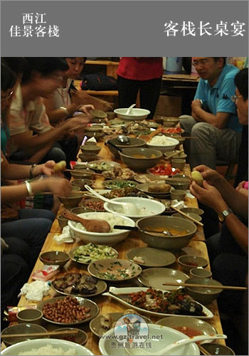 西江佳景客栈也是一家极具苗家特色的西江农家乐。苗民唱山歌、苗歌祝酒、烹制苗王鱼、酸汤鱼、鸡稀饭、苗家腊肉、南瓜汤、红蛋、苗家糯米酒开设苗家最高盛宴---长桌宴饮酒作乐,不亦乐乎。此外佳景客栈是由杨储源、周龙芳、陈庆剑、杨超丽等一些桂林旅游高等专科学校毕业自主创业的青年和西江千户苗寨寨民李慧联合开发经营的。在浓郁的苗族民族风情的基础上,这些受过专业旅游知识学习的年青人将会充分利用旅游专业知识更大地发掘、开发和宣传苗族民族文化和生活,使苗家特色得到最大的体现和推广。