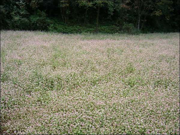 野角,(盛产荞麦)是毕节市一个山景壮丽的王国。平均海拔1800余米,山势磅礴险峻,怪石林立。在绝壁悬崖之巅存有许多极顶小平原,这些大山之巅的坝子地,常年芳草频铺灌木葱茏,冬天一过便绿烟四起,山花烂熳,牧歌轻悠,雀鸟翩唱。若逢农历三月或八月,趋车走过山野,来到绿色的山顶草场坝地,便能看到-种格外鲜亮清雅的紫红色、翠绿色和乳白色碎花细朵,汇集成为铺天盖地的奇妙画卷,竞相喧染着,野性而又柔美地奔涌到人们眼前,且瞬间就深深地钻入了你带着城市燥烦的心境。之后,随着一阵特有的激情冲击波划过心灵,这俏满天涯的野角荞花,便奇迹般地让人的心渐渐清雅闲静起来。这一刻,眼里心中的世界,一切皆是如此地无限美好。