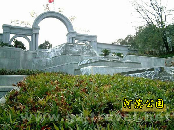 河滨公园位于贵阳市中心区西南部,前临环城南路,后傍南明河,故名河滨公园。公园南边山麓,河水清澈,古柳低垂,是夏天游泳的好地方。河上游的对岸,原生长着一棵大柳树,因此,公园的原名叫"杨柳湾"。
