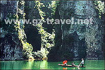 其四:鸳鸯化石。从架牛山往右,是壁陡深峡深、及富浪漫情调的鸳鸯峡,峡中峡外的湖面上,常常可以看到双双戏水的鸳鸯鸟,非常遗憾的是船鸣人声老是惊扰它们的鸳鸯春梦和绵绵情思。但也有不为世间万事万物所动、进入无我无他境界的荫千古情侣,这就是不远处的山顶上彼此面对、永不分离的一对化为石头的鸳鸯。相距不远依偎在一起的一对少男少女也化为岩石,小伙子身体健壮,面容坚毅,勇敢的目视前方;姑娘背依小伙子,低眉侧身,如泣如诉。世间至爱遇此人间仙境,怎不成就海枯石烂的千古绝唱呢!