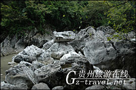 景区内,河中有洞、洞中有河,林中有水、水中有林的自然景观让人赏心悦目。清澈的流水呈现出一种天然通透的翡翠色,峡谷内植被茂盛,古树参天,藤萝密布,溶洞相连,一派绿色的世界。景区内还有其它地质奇观,如:“石蛋”群、“长寿泉”、“石观音”、“毛公像”等景点。