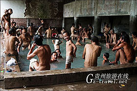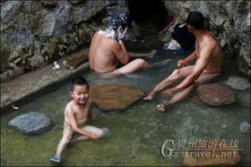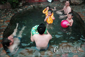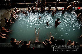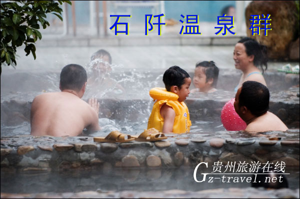 石阡,地处黔东北,因地质构造奇特,地热资源十分丰富,温泉出露点达20余处;另有一条地下热水河和热水溪,素有泉都之称。在众多的温泉中,以石阡温泉最为盛名。石阡温泉,又名城南温泉,位于县城南松明山麓,距龙川河右岩马鞍岩30米,高于江面12米。泉水从山麓石隙中间涌出,水温47.50c,出水量为45.83吨/小时。热气腾腾,水声哗哗,奔泻入江,源泉滚滚,昼夜不舍,冷暧相融,浪涛拍岩,珠飞玉溅,尉为惊叹。清郡守崔诗有赞曰:"斯泉灵幻极,地喷水如汤。暖沸肤添润,云蒸气自香。人心能去垢,炎世就生凉。独有探奇客,临流歌未央。"泉水中含有大量的矿物质,浴后可净肤发,愈风湿疮诸疾。《石阡县志》(民国)载:"冬浴则身暖而寒退,夏浴则体轻而闵生,夜浴则睡眠安稳,疲浴则精神复振......