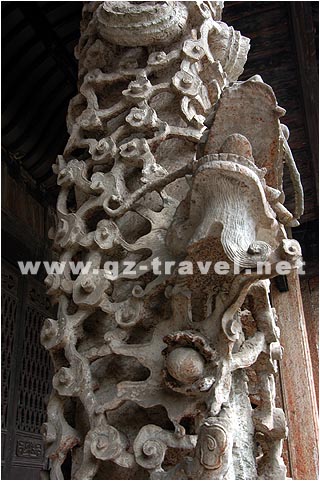 第二进大院东西两端,分别建一幢单间重檐歇山顶亭阁,称“桂香阁”,“尊经阁”。是祭祀时张榜公布祭孔官员名单处。今桂香阁尚存。沿九级石阶上,有一座面阔五间悬山顶式建筑,名“大成门”,又称“戟门”。大成门明间有一对大可合抱、高三米多的巨大楹柱,是整石深浮雕式盘龙石柱,柱础石狮背驮巨龙。狮首相对,龙身腾跃,气势非凡。