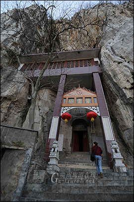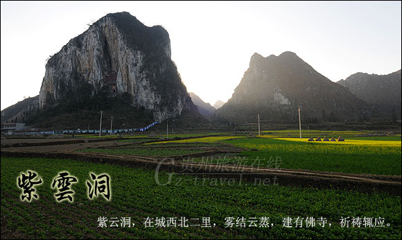 紫云洞位于紫云苗族布依族自治县城西一公里处。据《安顺府志》记载:“紫云洞,在城西北二里,雾结云蒸,建有佛寺,祈祷辄应”。由山脚沿石级蜿蜒而上,直达洞门,洞宽数丈,其右侧,于岩壁上刻有张元勋手书“别一洞天”四字,左壁岩石上有署名石廷栋五言诗一首及洞志铭,刻于清道光八年(公元1828)。原曾于洞门之上建有三层楼阁,黑柱、红壁、青瓦,飞檐凌空,花镂窗户。阁内第二殿有一樽四米多高镀金大佛,三层为玉皇殿,壁上有记述县宰政绩的碑刻文字。洞高50余米,岩浆水终年不断,滴入第一层池中,叮咚成韵。泉水甘冽,可供茶饮,其味清香无比。远眺洞景,林木翁翳,翠竹掩映。