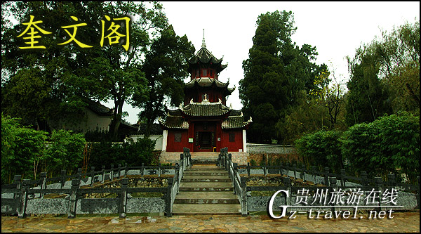 独山奎文阁由山门、阁楼、西厢房、一耳房组成两进院落,内设观世音、孔子、关羽、魁星牌位,是专供读书人祭祀魁星神的地方,另一个用途是“私塾学馆”,专门培育乡间学子,占地850多平方米,通高25米。楼阁建筑结构紧密,造型美观,雕刻精细,保留了清代建筑雕镂艺术特色,其古建筑是黔南的唯一。