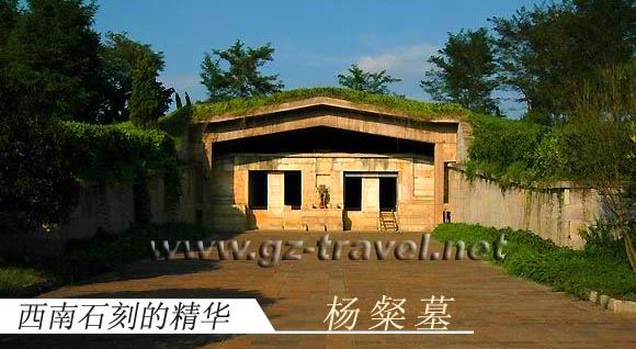 杨粲墓,坐落在贵州省遵义县龙坪永安皇坟嘴,距遵义市区10公里。建于南宋理宗淳祐年间。为平顶双室,用白砂岩条石砌筑,最大的一块石料达一万二千余斤,以子母扣层层套合的方法固定。占地面积50.1平方米,在西南地区已发掘的同类墓中居于首位。