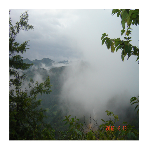 公路盘山而上又蜿蜒而下,我摇下玻璃,从窗口看出去,周围重峦叠嶂,一幅万山竞秀图!突然,山脚下白茫茫一片蒸腾,半山一排错落有致格调迥异的新房,转眼间模糊起来。乳白色的蒸汽像洪水,漫过村庄,漫过树林,漫过山峦。游曳着,环绕着。像新娘透明的婚纱,清雅妙曼。我们靠边停车,端起相机“咔嚓咔嚓”拍起来。